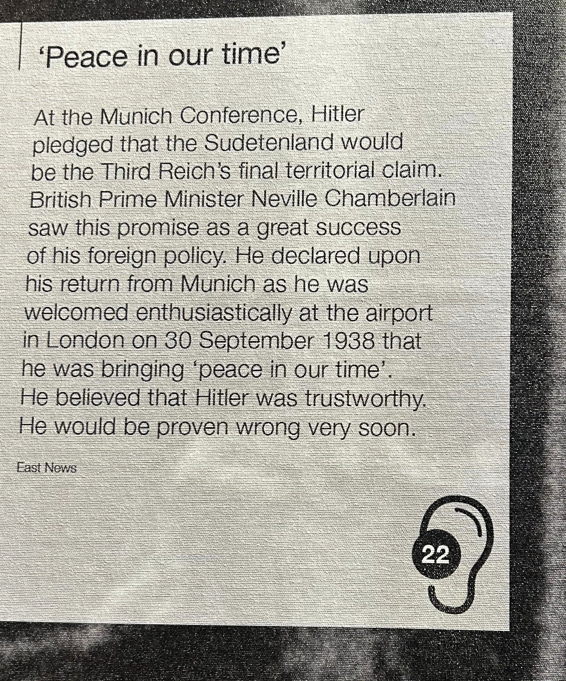 Det var som svar på detta uttalande som Winston Churchill yttrade de bevingade orden: “You were given the choice between war and dishonour. You chose dishonour, and you will have war.” (”Ni hade ett val mellan krig och förnedring. Ni valde förnedring, och ni kommer att få krig.”)