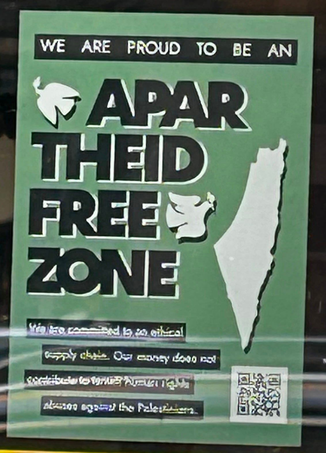 En apartheidfri zon (AFZ) “är en verksamhet som aktivt vägrar bidra till Israels folkrättsbrott". Bevisen för dessa påstådda folkrättsbrott framgår inte. Det behövs inte heller. Numera är allt som hävdas om Israel, som är ofördelaktigt och demoniserande, per se sant. Israel kan nämligen inte göra rätt - eftersom landet i sig är fel.